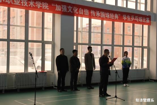 为进一步激发国球的文化底蕴,培育学生拼搏进取、永不放弃的“国球精神”,在全院范围营造积极参与体育锻炼的良好氛围,根据学院第八届校园文化艺术节相关部署要求,由学院团委主办、经济管理系承办呼伦贝尔职业技术学院的“加强文化自信 传承国球经典”学生乒乓球比赛于2018年4月18日16:00学院主楼1楼乒羽馆正式开幕,学院学生处副处长高建国、学院团委副书记于健、经济管理系副主任郭志成出席开幕式,经济管理系学工办主任陈志杰主持,来学院九个教学系部参赛选手、带队教师及观众约300人参加开幕式。